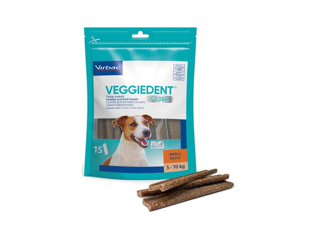 CET VeggieDent Ochucené doplňkové krmivo pro malé psy (5-10 kg) /15 žvýkacích plátků. Rostlinné žvýkací plátky, které udrží zubní kámen a plak pod kontrolou. CET VeggieDent Chews s inovativním Z-tvarem, který psovi usnadňuje plátek uchopit a žvýkat. Tento tvar, velikost a textura pomáhají redukovat tvorbu plaku a zubního kamene, slouží tak jako doplněk k běžnému čištění zubů. Produkt získal razítko VOHC (Veterinary Oral Health Council = Veterinární rada pro orální zdraví). Rada označení uděluje pouze produktům, které doloží požadované výsledky účinnosti redukce plaku a zubního kamene. Balení obsahuje 15 ks. Složení: Kukuřičný škrob, glycerin, sójový proteinový koncentrát, rýžová mouka, pivní kvasnice, sorbitol, klasy kukuřice, polyol (erytritol), čekankový inulin, koncentrát z granátového jablka. Analytické složky: Hrubý protein 19,0%, hrubý popel 1,8%, hrubá vláknina 1,3%, hrubý tuk 0,9%. Návod k použití: Podávejte psovi 1 žvýkačku CET VeggieDent denně nebo podle pokynů veterináře. Tento přípravek je vhodný pro psy mezi 5 - 10 kg. Vždy by měla být k dispozici čerstvá pitná voda. Způsob uchovávání: Uchovávejte na suchém místě při pokojové teplotě.Doplňkové parametry