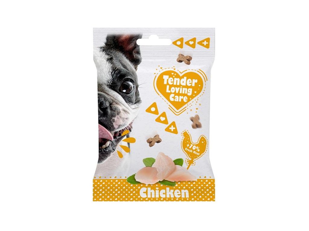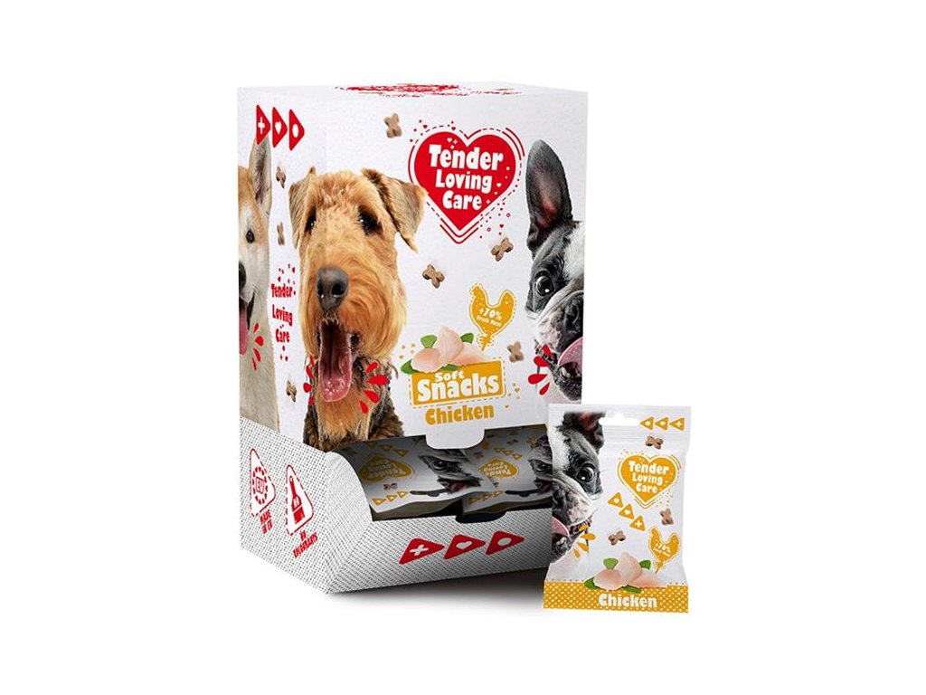 Pamlsky Duvo+ Tender Loving Care jsou velmi chutné a měkké pamlsky pro psy. Jsou vyráběny v EU a neobsahují žádná umělá barviva ani aromata. Tato bezlepková varianta se kuřetem obsahuje víc než 70 % čerstvého masa, rýže a oreganového oleje pro optimální strukturu a chuť. Hypoalergenní pamlsek bez genetických modifikací je ideální pro trénink psa. Jsou vhodné pro všechny psy od šesti měsíců. Výhody: Vysoký obsah čerstvého masa (70 %). Bez umělých aromat a barviv. Vyrobeno v EU. Bezlepkové, bez GMO a hypoalergenní. Ideální na trénink. Složení: Maso a produkty živočišného původu (30,6 % kuřecí), obiloviny (7,7 % rýže), vedlejší výrobky rostlinného původu, minerální látky. Analytické složky: Hrubý protein 24,1 %, obsah tuku 10,2 %, hrubá vláknina 1,36 %, hrubý popel 12,0 %. Doplňkové látky: obsahuje EU povolená konzervanty a antioxidanty. Krmný návod: Doporučujeme podávat pod dohledem, slouží jako doplnění běžné krmné dávky. Zajistěte psovi vždy dostatek pitné vody. Není určeno pro lidskou spotřebu.Doplňkové parametry